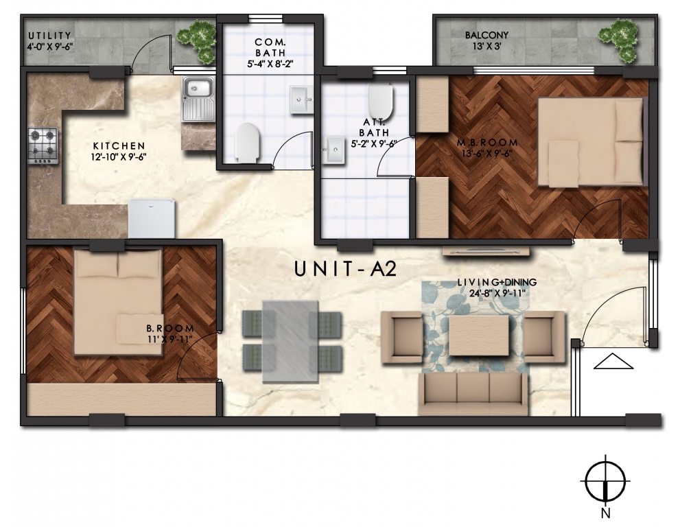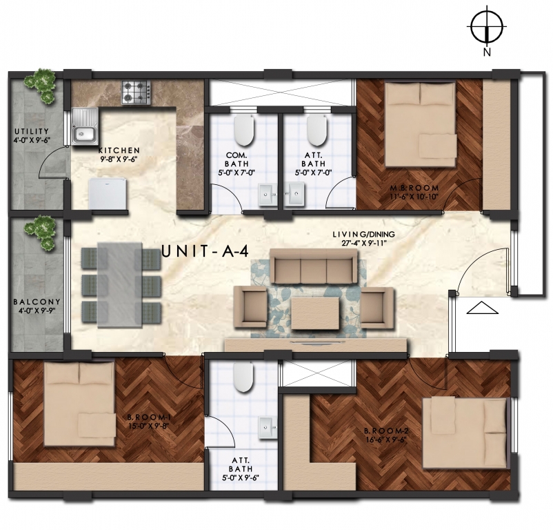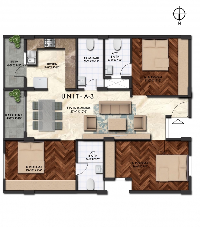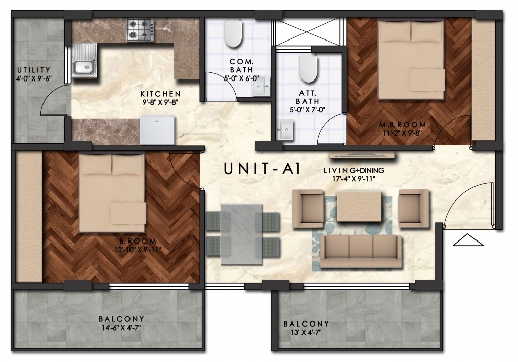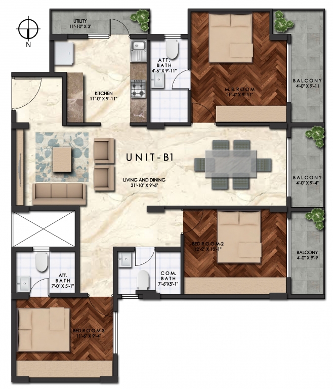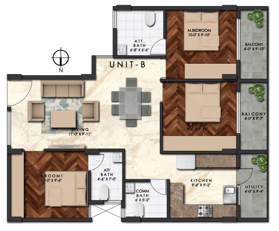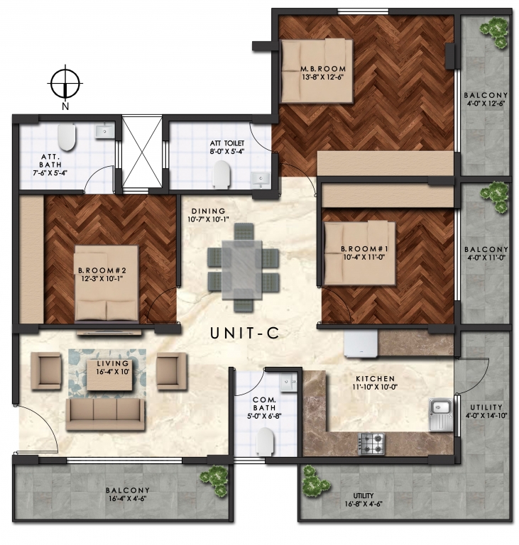 Living / Dining / Bedrooms: Vitrified |Â Kitchen: Anti-skid Ceramic Tiles |Â Balcony: Weather-proof, Anti-skid Tiles |Â Utility / Servant’s Room: Ceramic Tiles